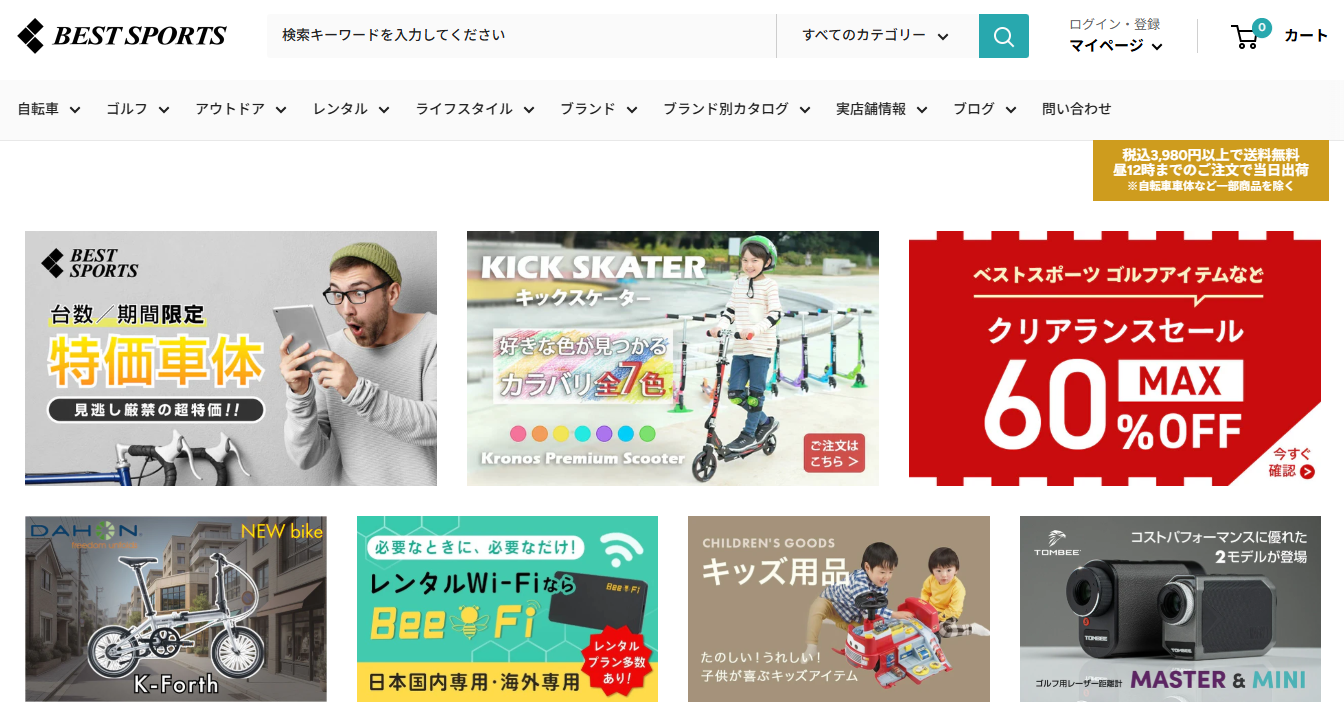 「BESTSPORTS(ベストスポーツ)」は、自転車をはじめとしたスポーツ用品やアウトドアギアを幅広く取り扱うオンラインショップです。