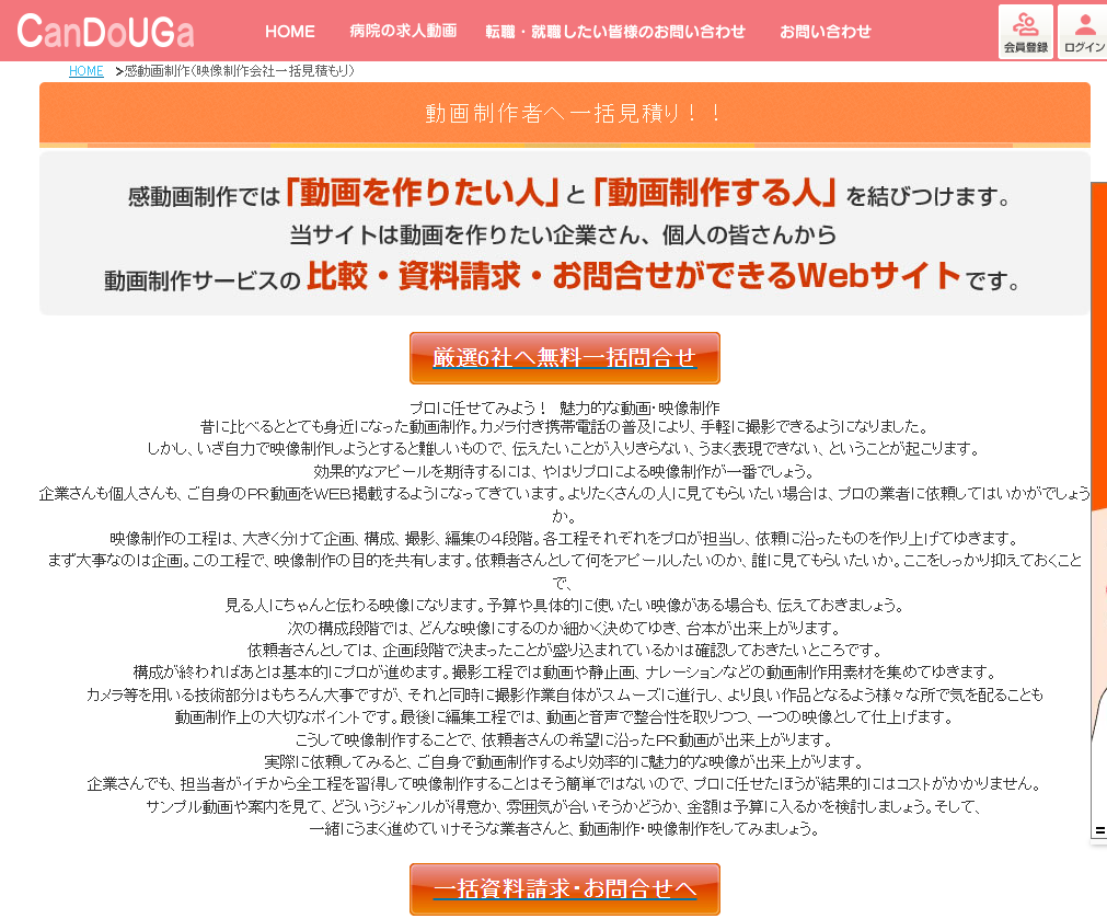 「感動画制作」は、企業や個人が動画制作を依頼したいときに、複数の動画・映像制作者から一括で見積り・提案を受けられるマッチング型サービスです。