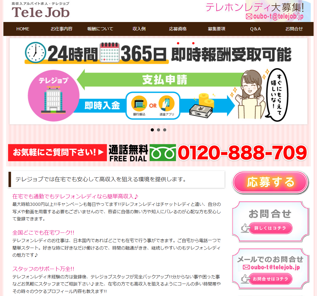 テレジョブは、テレフォンレディ(電話越しの会話を通じて報酬を得るワーク)に特化した求人・マッチングサービスです。
