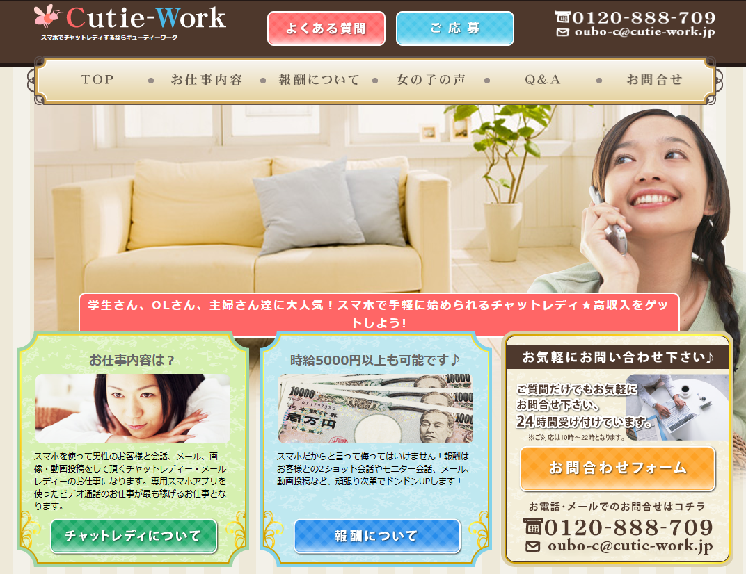 「キューティーワーク」は、在宅で取り組める通話・コミュニケーション系のワークを紹介するサービスです。
