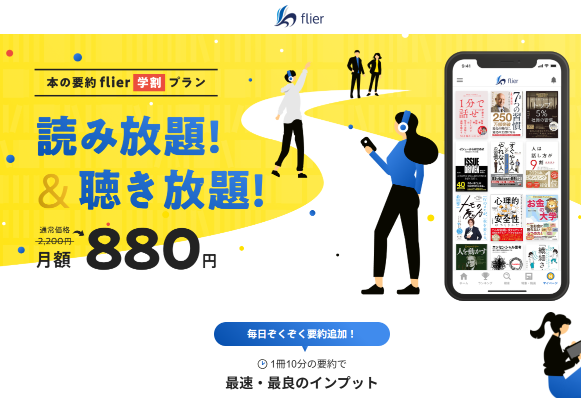 flier(フライヤー)学割プランは、ビジネス書や実用書の要点を短時間で読める要約サービスを、学生が利用しやすい条件で提供するプランです。