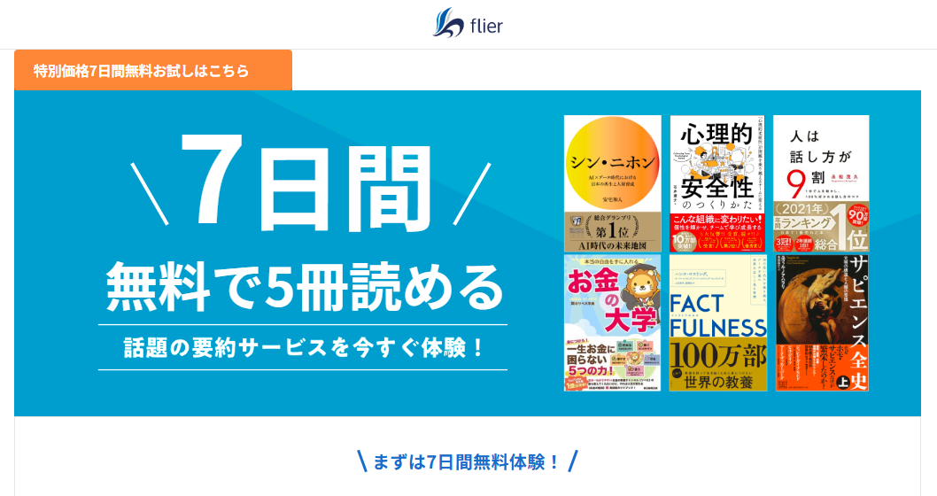 flier(フライヤー)は、ビジネス書や実用書を中心に、書籍の要点を短時間で把握できる要約読書サービスです。